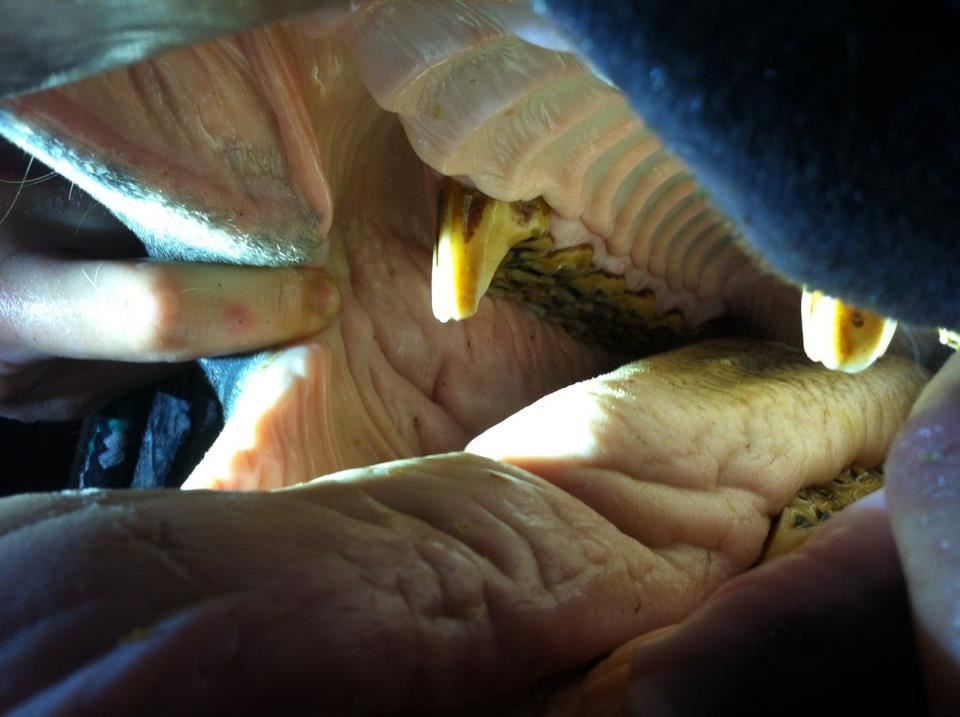 A horse’s jaw in designed with the top set of teeth wider than the bottom set. In the wild, the horse’s natural chewing motion and the types of forages they eat work to wear down their teeth uniformly. Domesticated horses rarely eat as they would in the wild, resulting in most of the common issues we see during routine dentals. Because of their mouth conformation, horses develop what we call “sharp buccal edges.” This simply means that the outer edges of the upper teeth and the inner edges of the lower teeth become sharp and can cause cuts to the cheeks and tongue. If we do find some cuts in your horses’ cheeks, it’s usually nothing to worry about. Once the sharp points are taken care of, the mouth generally heals within 7-10 days.