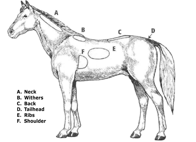 We are often asked by clients if their horse is too fat or too skinny. As we don’t currently have a scale in the trailer, our next best tools are body condition scoring (BCS) and weight tapes. BCS is based on the Henneke (“Hi-nec-kee”) horse body condition scoring system first developed in the 1980’s. The scale ranges from 1, being poor, to 9, being extremely fat/obese. Most healthy horses range between 4-6, depending on their use.1 I personally use half points, if needed on certain horses, to give a more precise number. There are 6 main points on the horse’s body that store fat and are used to assess BCS. These include the neck, withers, back, shoulders, ribs, and tailhead (see picture below). By using a combination of palpation (touch) and visual observation, we can arrive at a score.